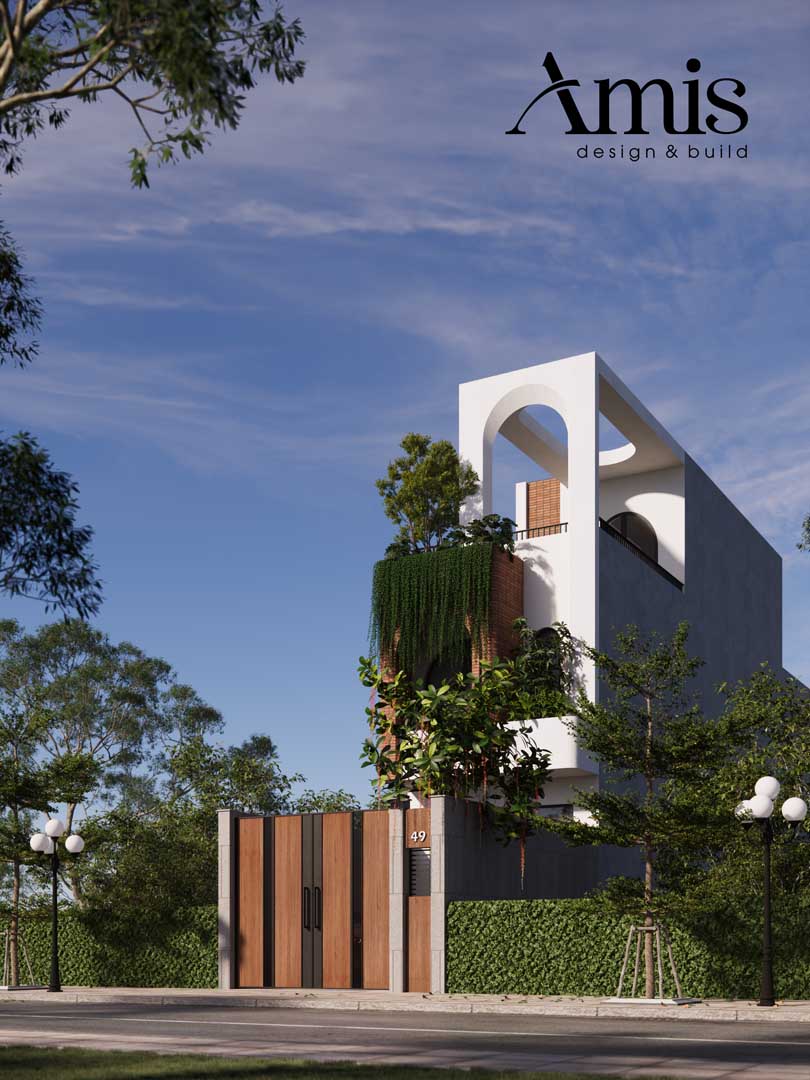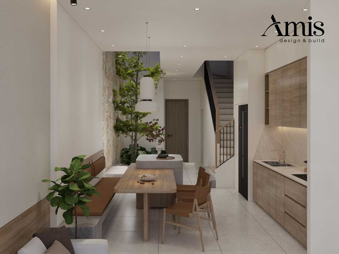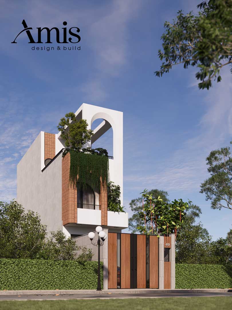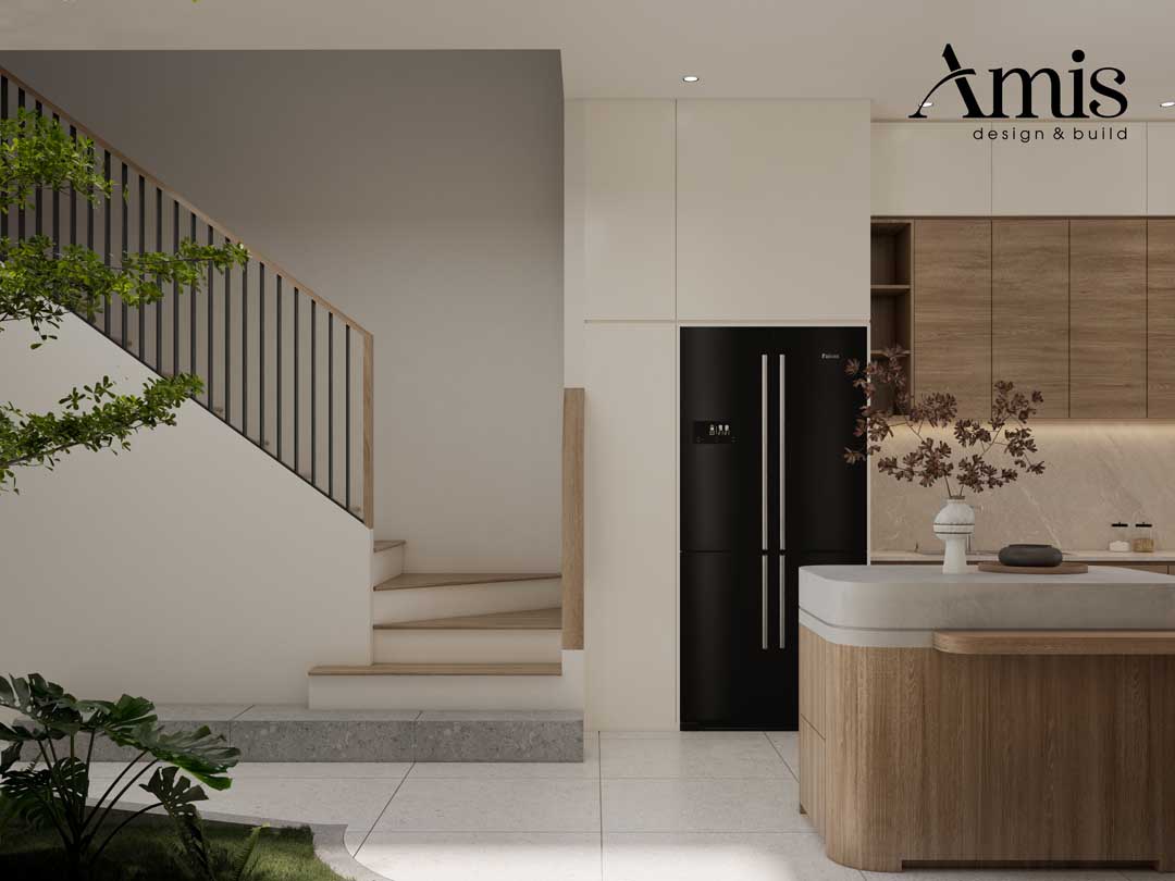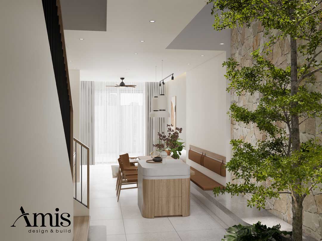 Ý tưởng thiết kế nhà phố 360m2 xuất phát từ khát khao tạo ra một tổ ấm hiện đại nhưng không kém phần ấm cúng và gần gũi. Kiến trúc sư Amis Design đã khéo léo vận dụng ngôn ngữ thiết kế tối giản, loại bỏ những chi tiết thừa để tập trung vào bản chất của không gian sống.