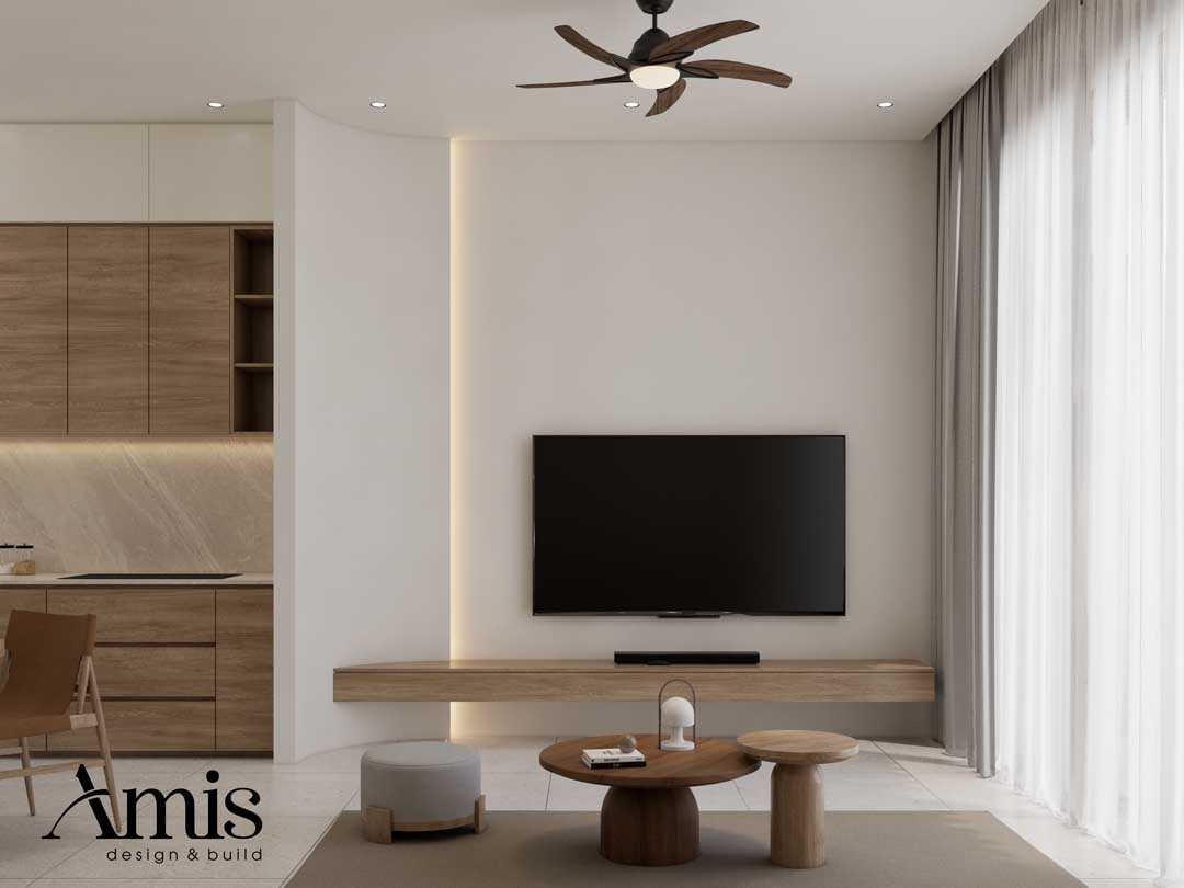 Việc bố trí nội thất tuân theo nguyên tắc "Less is More", tạo ra không gian thoáng đãng và dễ chịu. Khu vực phòng khách được kết nối một cách tự nhiên với không gian bếp và phòng ăn phù hợp với lối sống hiện đại.